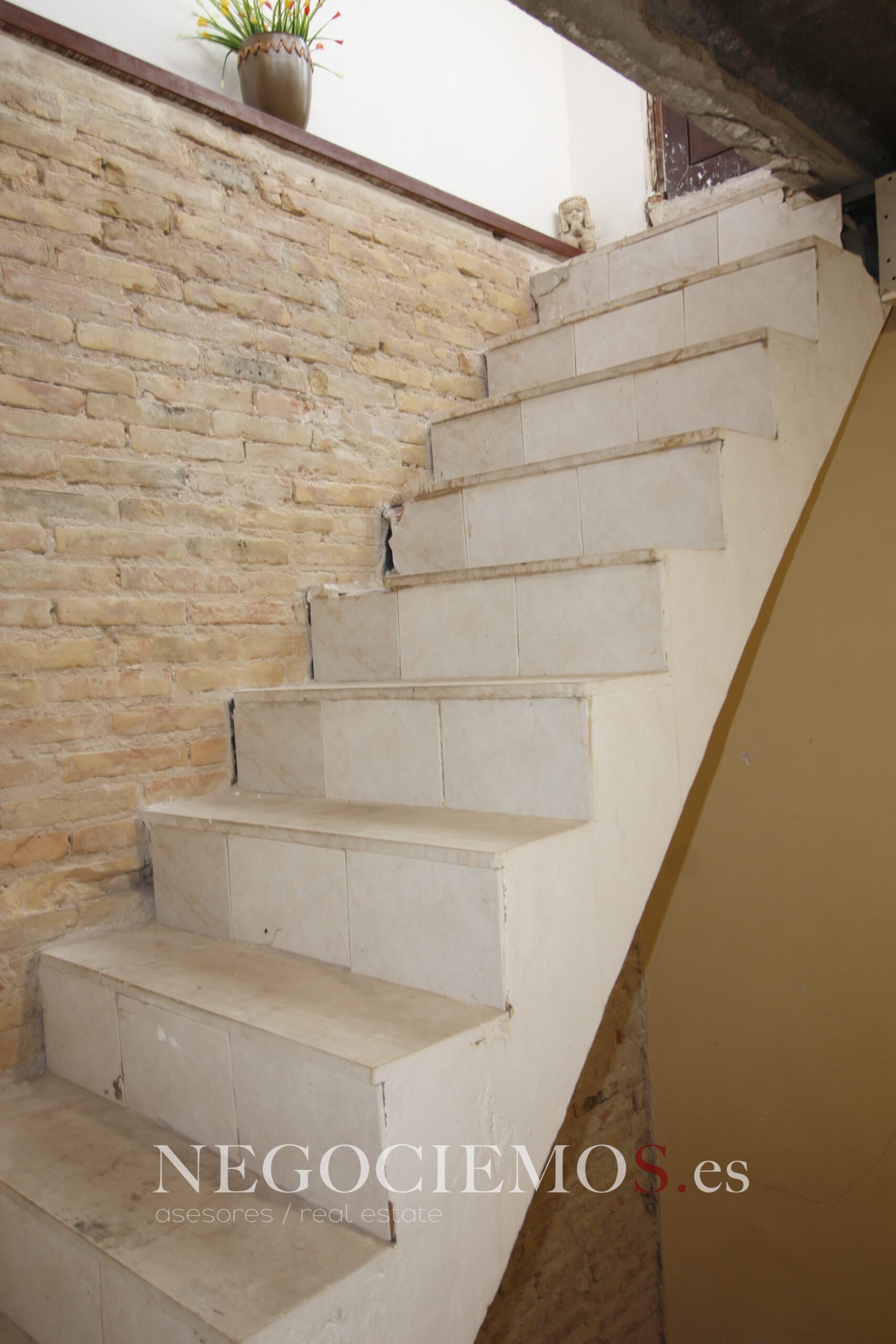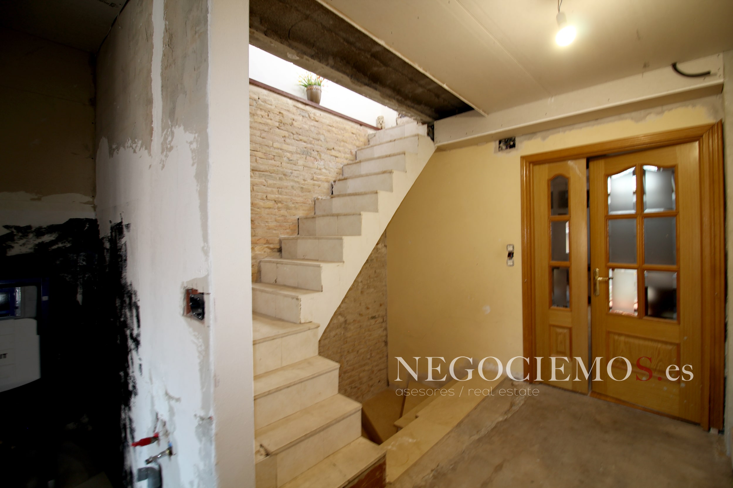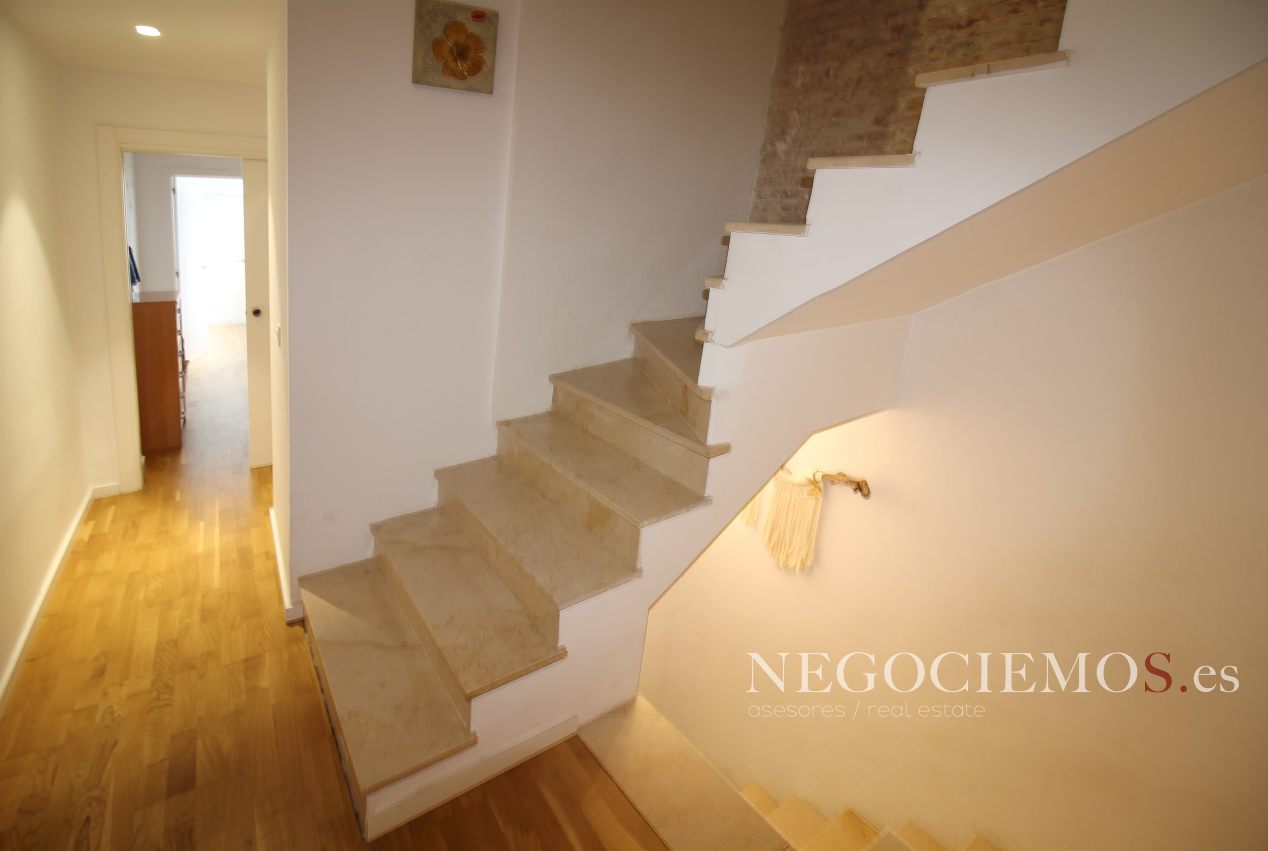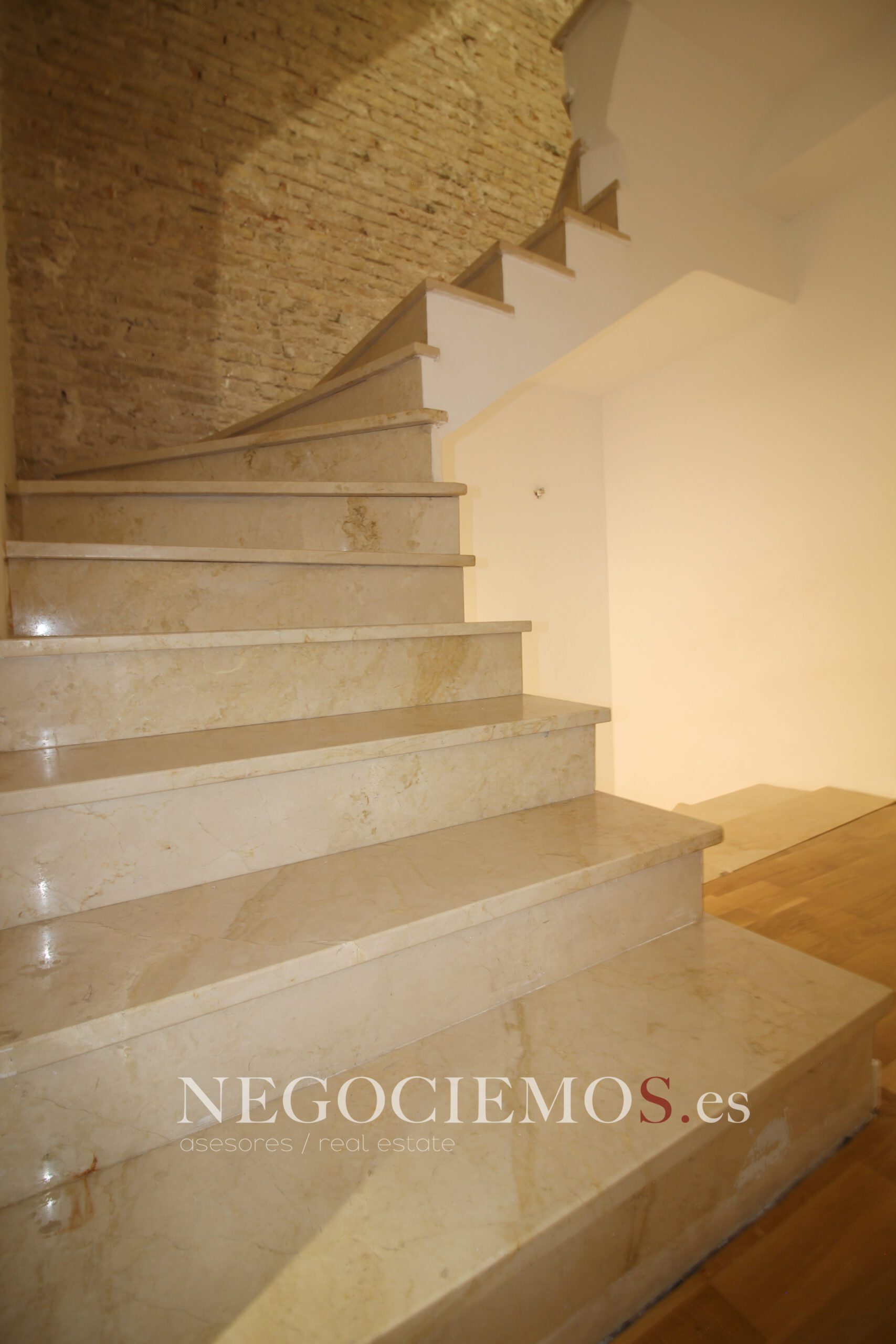 Remodelada en 2020 conserva sus materiales de origen como el ladrillo visto de barro en paredes junto a unos modernos y cuidados techos con relieves e iluminación led, así mismo los suelos de marmol travertino y parquet le confieren un contraste elegante, moderno y acogedor. Consta de un tragaluz en el patio inglés aportando un plus de luz y espacio en todas sus plantas.