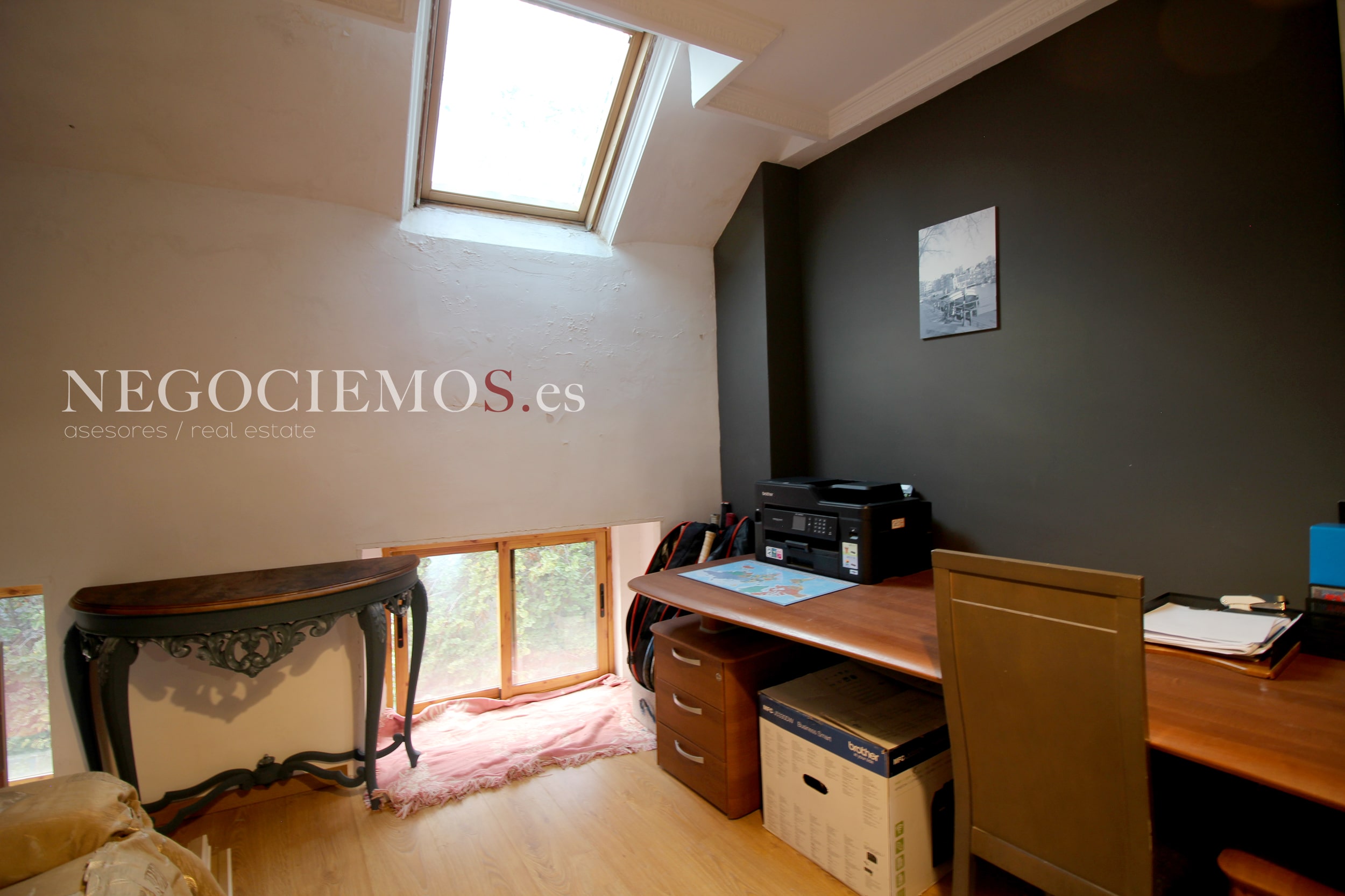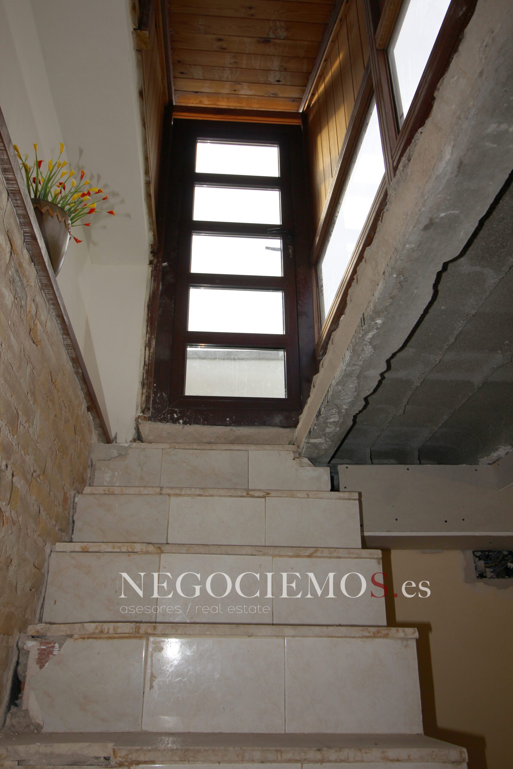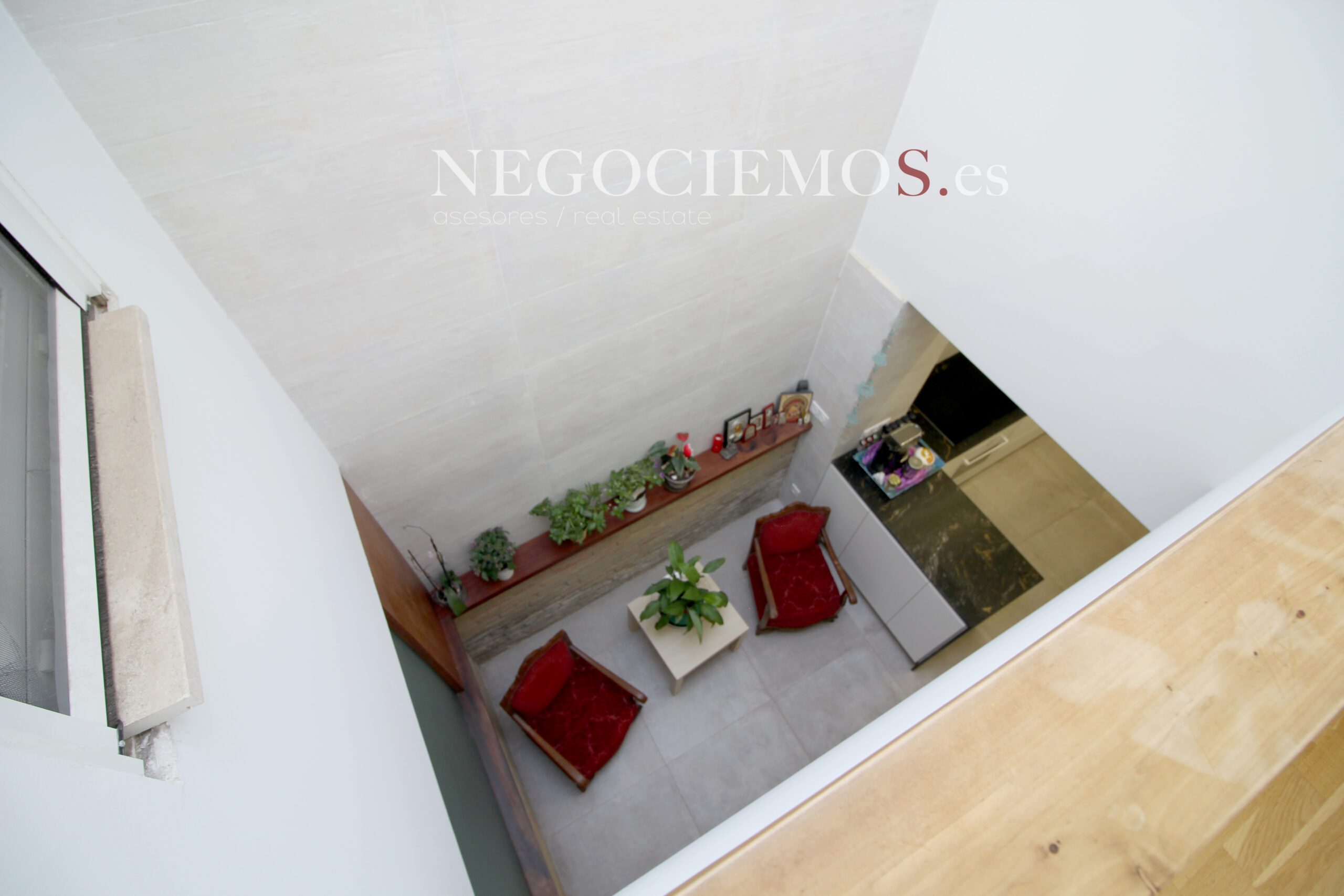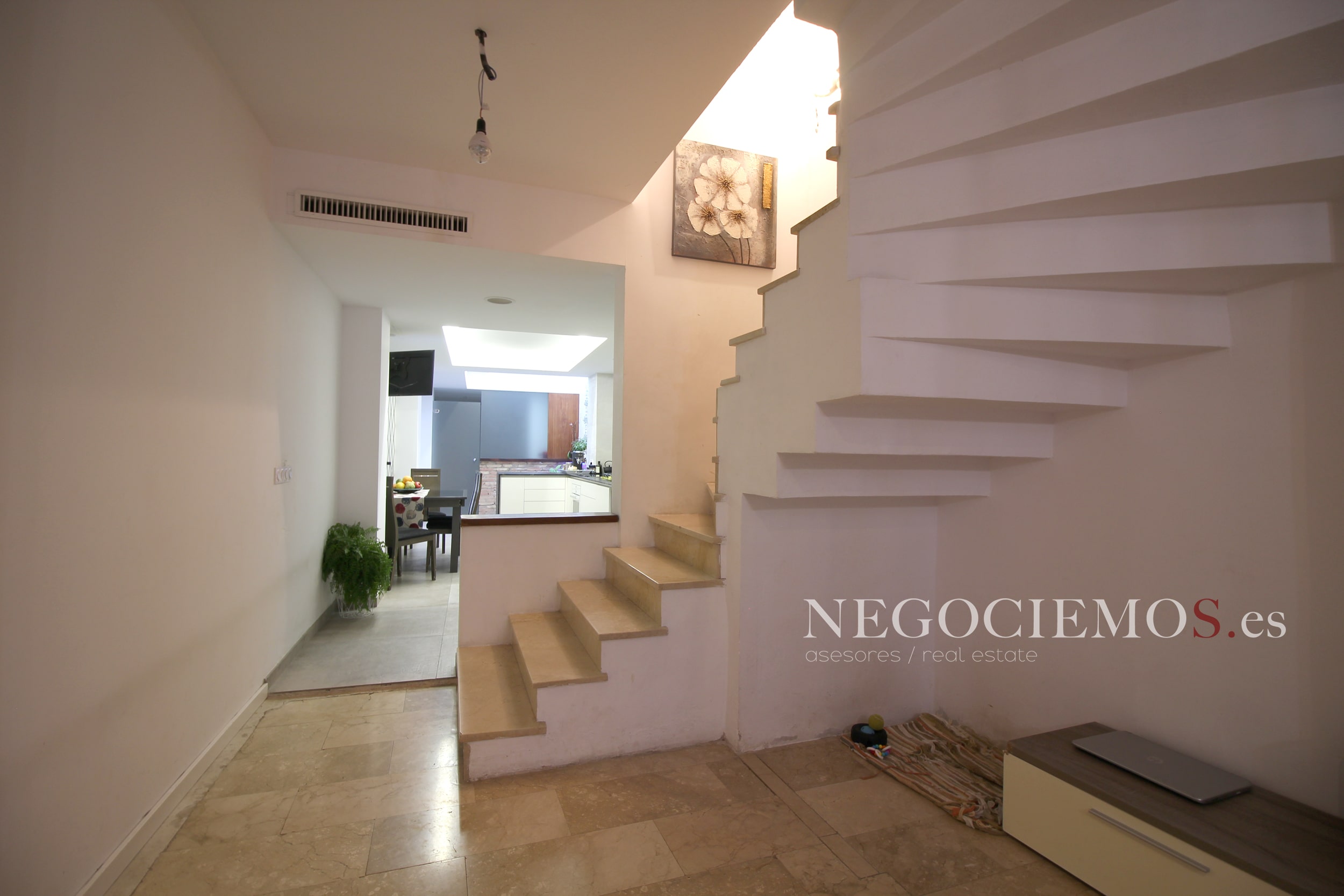 Remodelada en 2020 conserva sus materiales de origen como el ladrillo visto de barro en paredes junto a unos modernos y cuidados techos con relieves e iluminación led, así mismo los suelos de marmol travertino y parquet le confieren un contraste elegante, moderno y acogedor. Consta de un tragaluz en el patio inglés aportando un plus de luz y espacio en todas sus plantas.