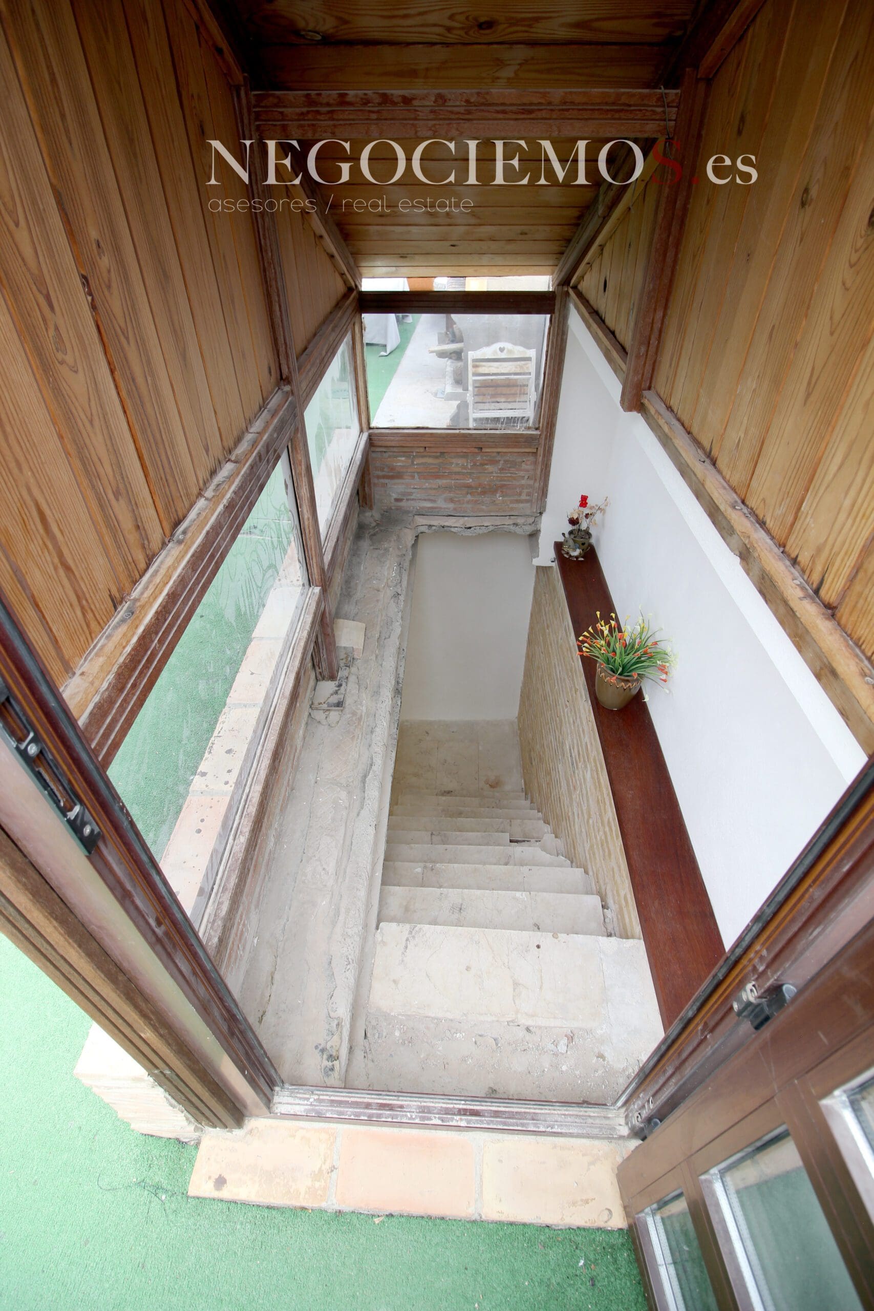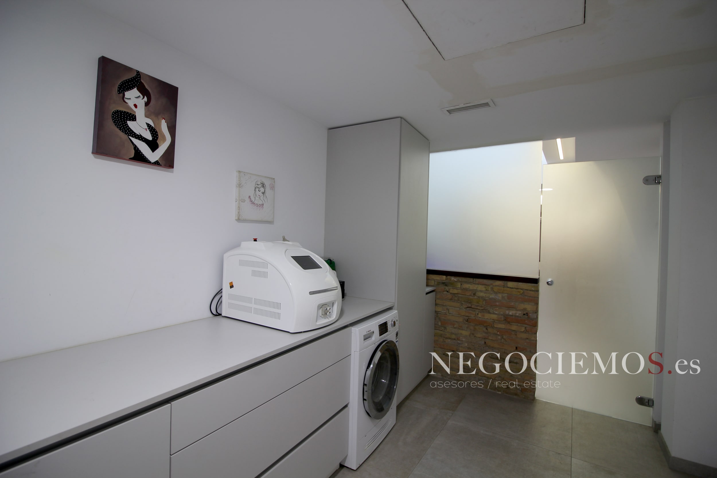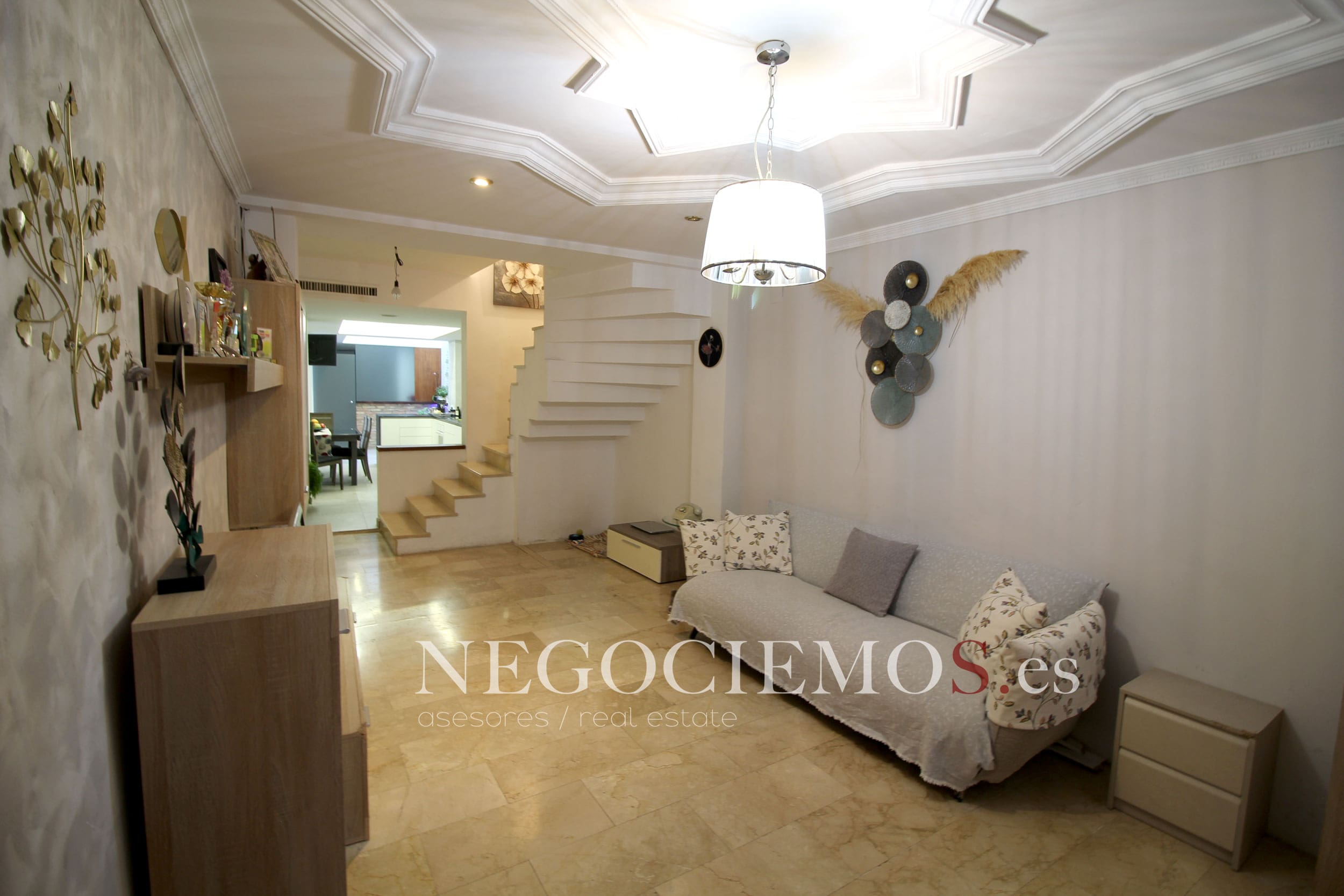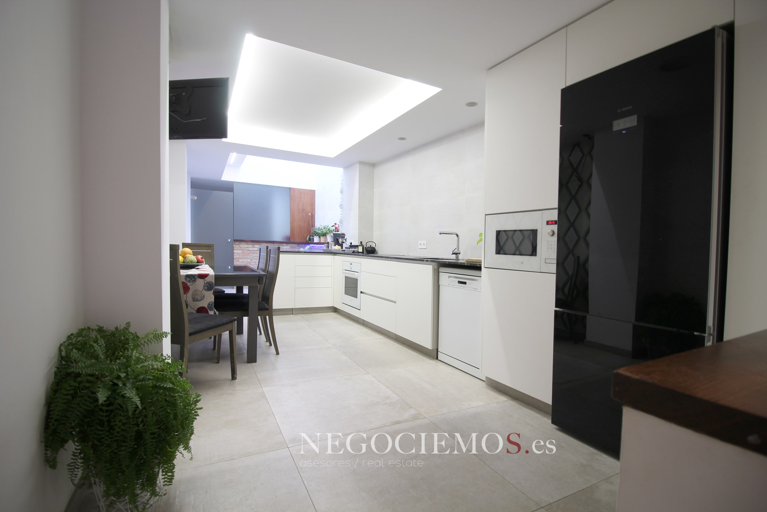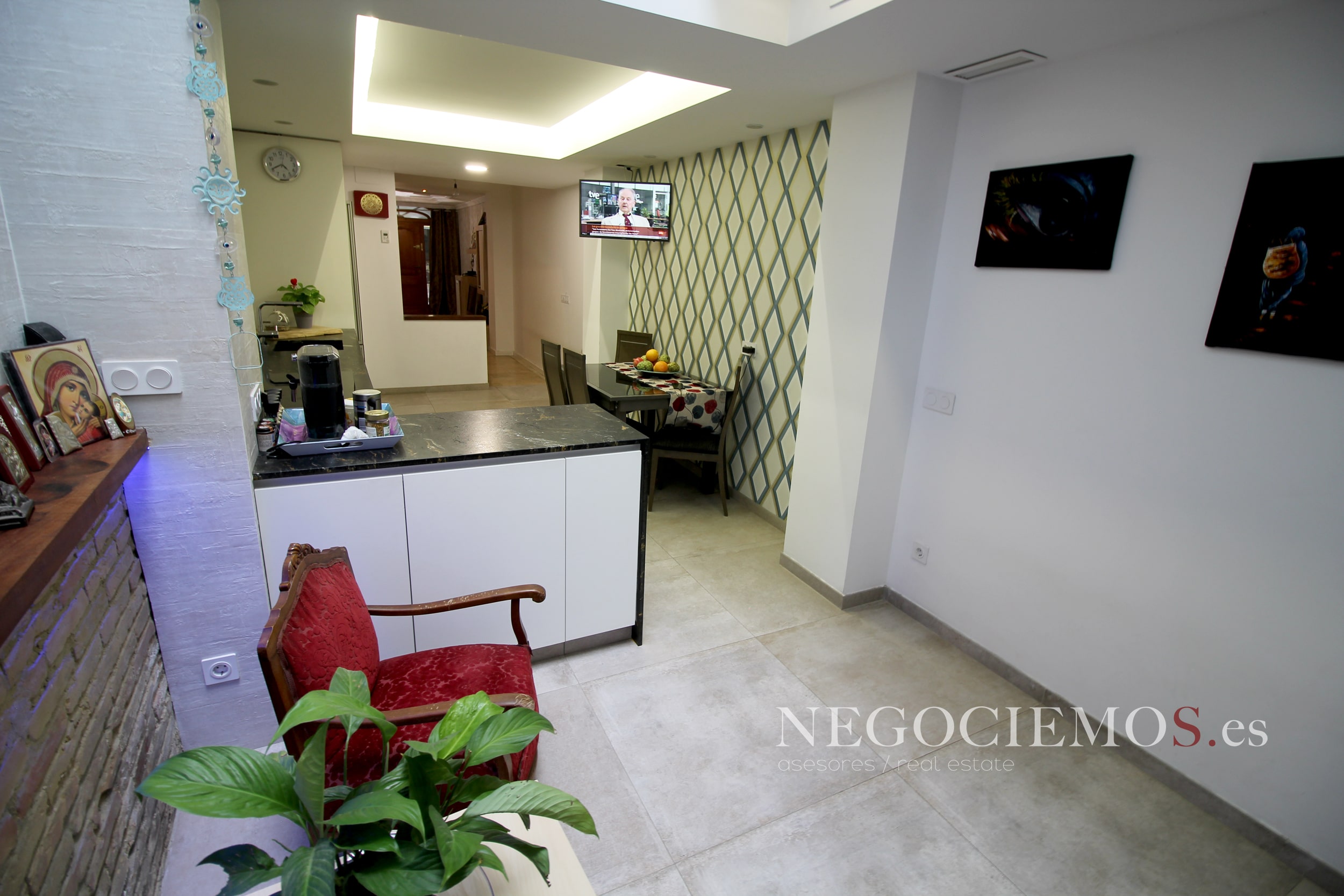 Remodelada en 2020 conserva sus materiales de origen como el ladrillo visto de barro en paredes junto a unos modernos y cuidados techos con relieves e iluminación led, así mismo los suelos de marmol travertino y parquet le confieren un contraste elegante, moderno y acogedor. Consta de un tragaluz en el patio inglés aportando un plus de luz y espacio en todas sus plantas.
