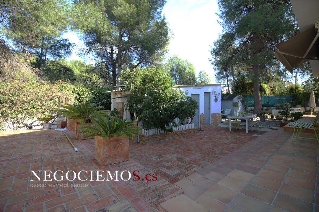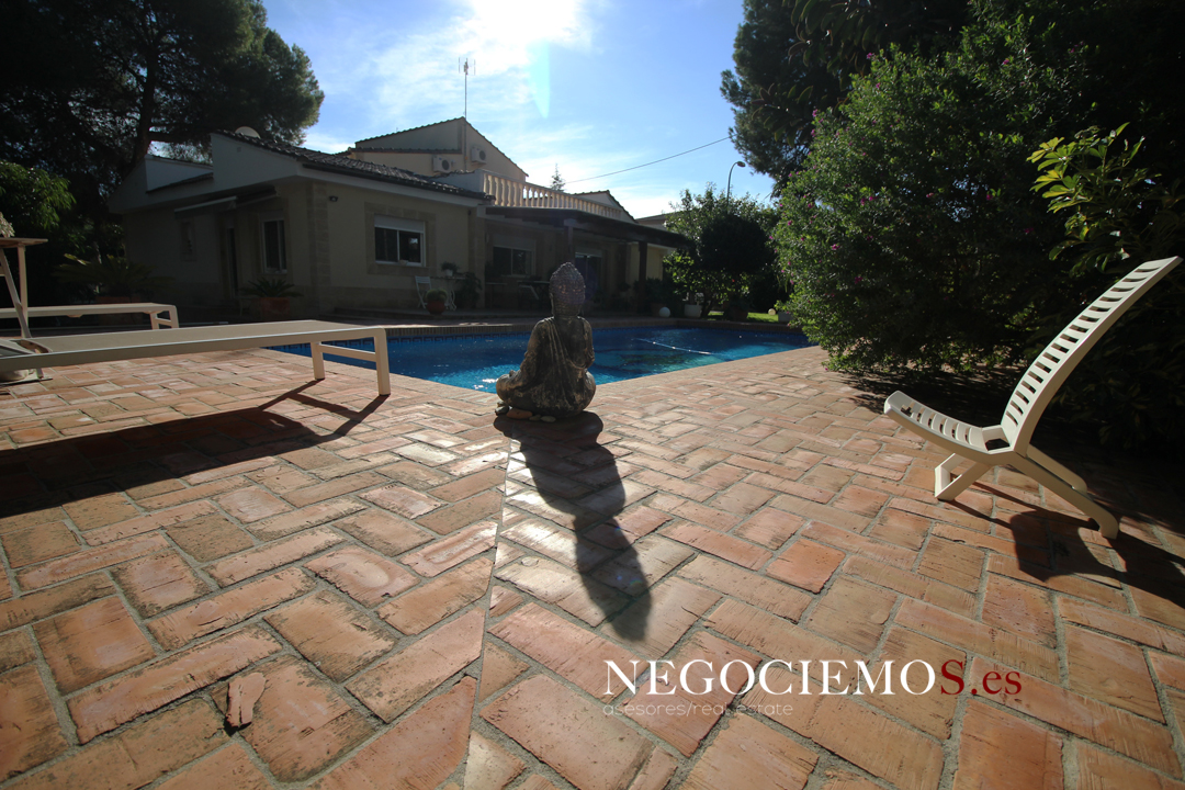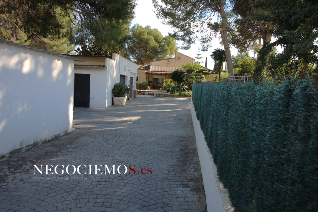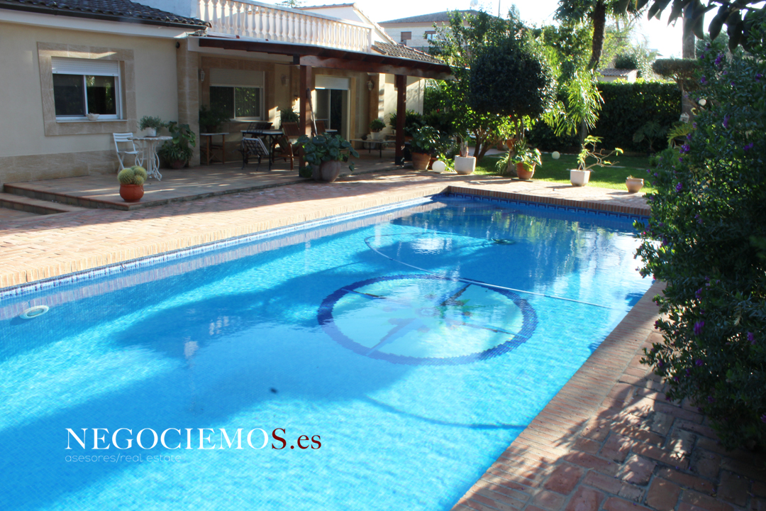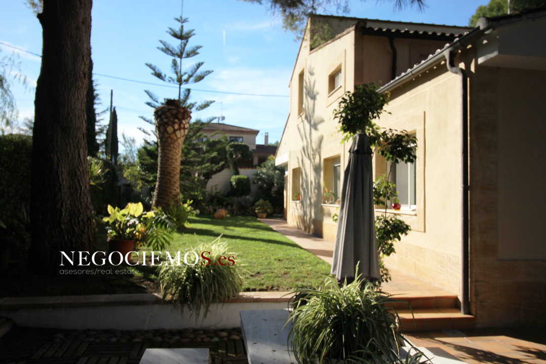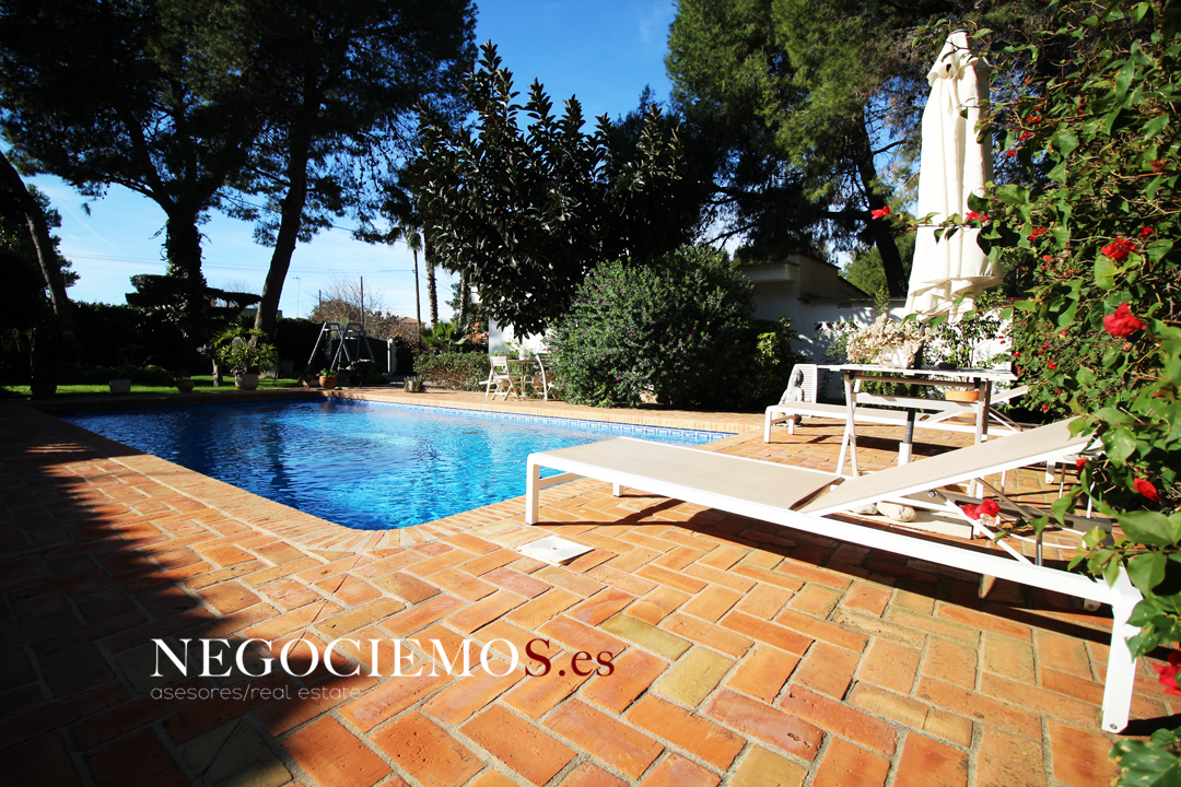 Fantástico chalet individual con imponente jardín; 1862 mtrs2, ( conserva incluso las antiguas cuadras para caballos y su pista de trote que disponía su inicial propietario ) y amplia piscina ( 10 x 5 mtrs ) colindante a 3 calles en la parte alta de Montealegre.